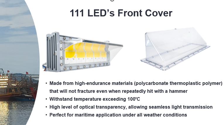 The 111 LED light’s front cover is specially made from polycarbonate thermoplastic polymer.